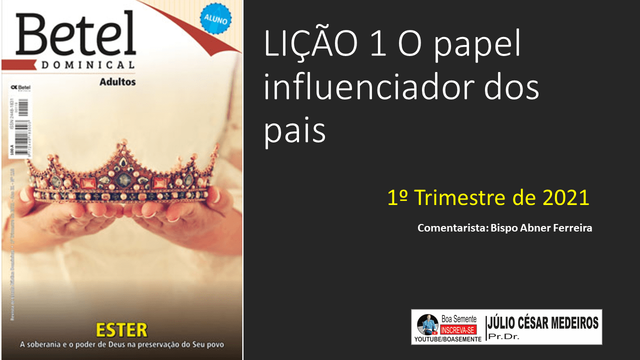 A lição 1 o papel influenciador dos pais 1º tri 2021, é um quadro da EBD.COM, baseado nas revistas da Editora Betel Dominical, do 1º trimestre de 2021. “Levando a boa semente aos corações”