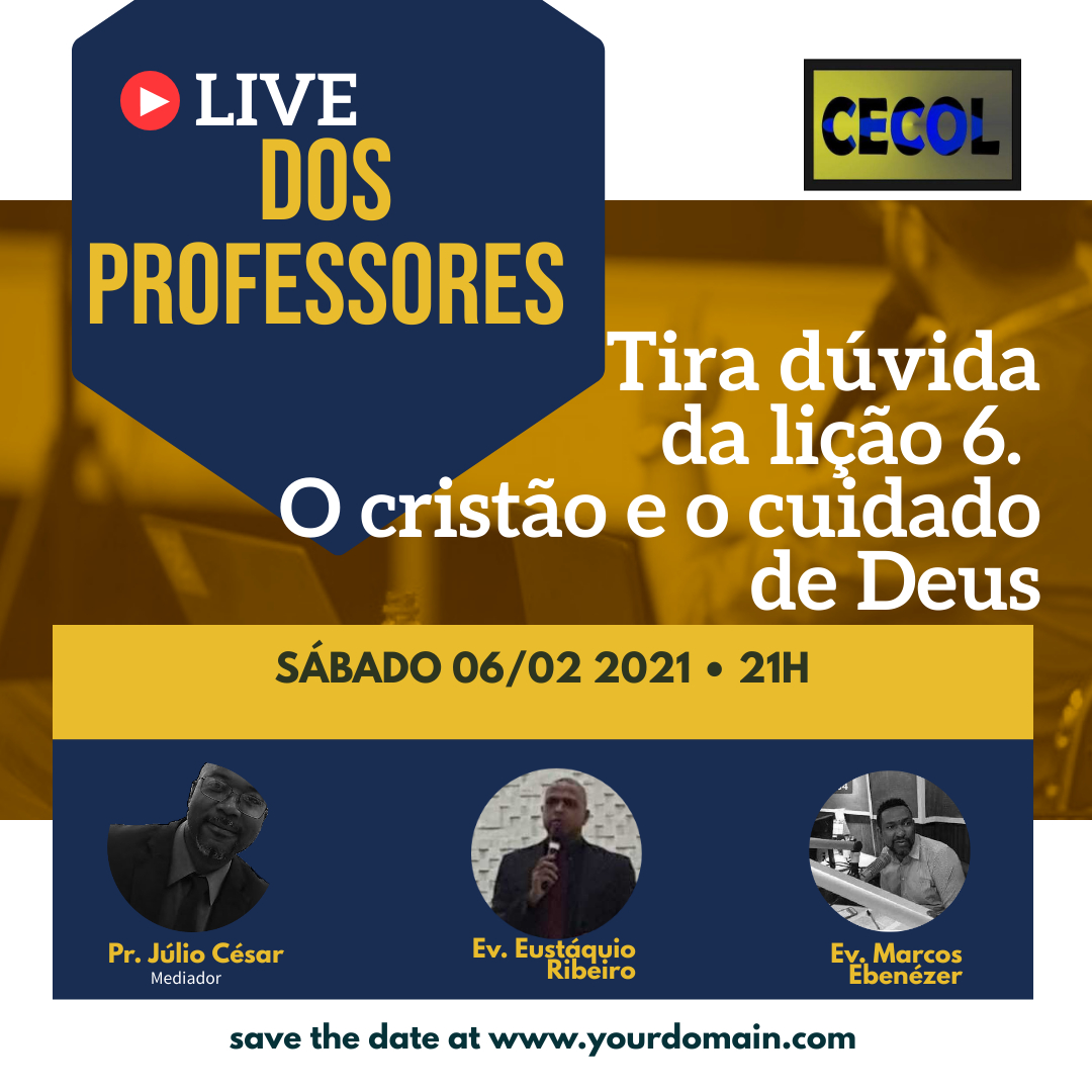 Olá, logo mais teremos dois pastores convidados na Live dos Professores, Tema: tira dúvidas da lição 6. O cristão e o cuidado de Deus. Espero todos vocês do canal Boa Semente para conversarmos ao vivo! não percam, hoje, às 21h. Não faltem, este é o link da transmissão. PAz