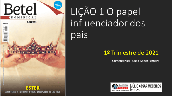 Assista primeiro a vídeo aula aqui e depois baixe o slide e use em sua aula https://youtu.be/B0xLZr0VNQI A lição 1 o papel influenciador dos pais 1º tri 2021, é um quadro da EBD.COM, baseado nas revistas da Editora Betel Dominical, do 1º trimestre de 2021. "Levando a boa semente aos corações" licao-1-do-1o-tri-2021Baixar Precisa de mais... Continuar Lendo →
