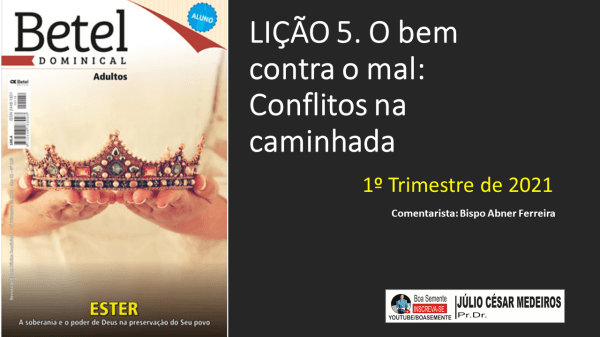 Editora Betel Dominical 1º tri 2021 Assista a nossa video aqui e depois baixe gratuitamente o slide para usar como desejar https://youtu.be/17d6SlMQYqg Lição 5 o bem contra o mal conflitos na caminhada Editora Betel Dominical 1º tri 2021 é uma pre aula da EBD.COMm baseada nas revistas da Editora Betel Dominical Baixe o slide desta... Continuar Lendo →